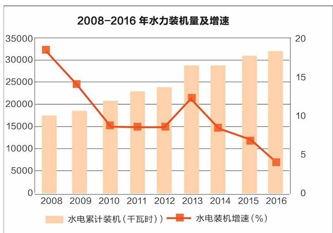 這種情況,直到2009年,節(jié)能減排的壓力加大后才有所緩解。在這一年,中國提出了2020年非化石能源消費(fèi)占能源消費(fèi)總量15%的目標(biāo),同時(shí)作出了2020年單位GDP能耗降低40%到45%的承諾。由于當(dāng)時(shí)的風(fēng)電和太陽能規(guī)模不大,因此在決策層看來,水電是最現(xiàn)實(shí)的推動(dòng)節(jié)能減排的替代能源。自2010年起,中央政府開始逐漸對水電松綁,一批之前有爭議的項(xiàng)目紛紛重啟。這段曲折的經(jīng)歷投射到水電裝機(jī)量上,表現(xiàn)在2010和2011年的水電裝機(jī)增速出現(xiàn)了明顯的下滑趨勢,直到2013年后,西南地區(qū)解禁的水電項(xiàng)目逐漸落地投產(chǎn),才推遲了水電裝機(jī)增速放緩的勢頭。