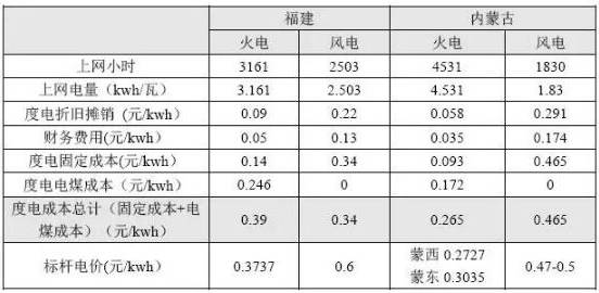 表4:福建、內(nèi)蒙新投產(chǎn)火電、風(fēng)電機(jī)組度電成本比較