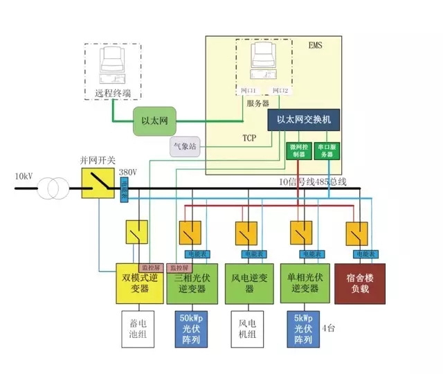 為了實現(xiàn)多種電力和能源的有效匹配及運行效益最大化,微網(wǎng)系統(tǒng)需要能量管理系統(tǒng)(EMS)對系統(tǒng)運行進行監(jiān)視和管理,例如通過EMS進行分布式電源能量調(diào)度、儲能系統(tǒng)管理、負荷能效分析、并網(wǎng)/孤島模式自動切換、系統(tǒng)地潮流穩(wěn)定控制等。