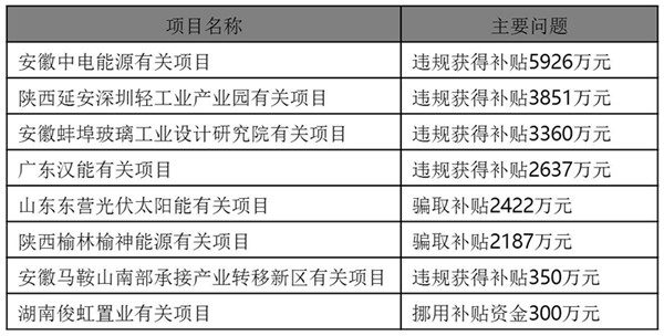 2013年6月,審計(jì)署公布《5044個(gè)能源節(jié)約利用、可再生能源和資源綜合利用項(xiàng)目審計(jì)結(jié)果》,其中8個(gè)違規(guī)使用資金的金太陽(yáng)工程項(xiàng)目被查處,違規(guī)方式主要包括:編造虛假申報(bào)材料,套取、騙取資金;擠占、挪用資金用于生產(chǎn)經(jīng)營(yíng)、業(yè)務(wù)經(jīng)費(fèi)等支出;以“報(bào)大建小”、重復(fù)申報(bào)等方式違規(guī)獲得資金等。8個(gè)項(xiàng)目合計(jì)涉及違規(guī)補(bǔ)貼金額2.1億元。占參與抽查的金太陽(yáng)工程項(xiàng)目資金總規(guī)模的2.58%,8個(gè)項(xiàng)目總規(guī)模64.298兆瓦,占被抽查總裝機(jī)規(guī)模的29%。