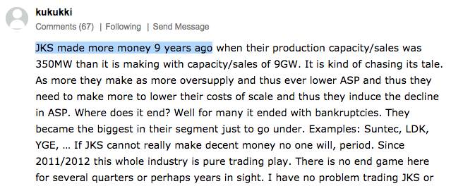 中國儲能網(wǎng)訊:這幾天一直在看SA上的帖子的評論,kukukki下面這個帖子寫的有點沮喪,大意是說9年以前晶科每年賣350MW的組件,現(xiàn)在賣9GW組件,但是公司賺的錢卻比9年前的還少。