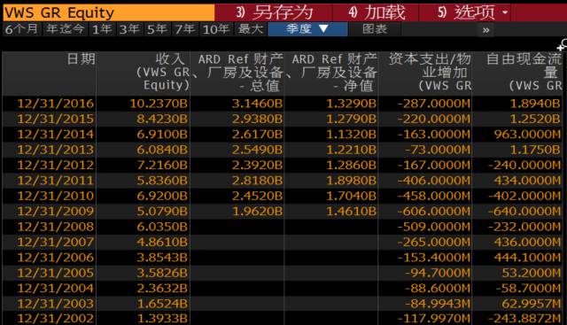 先看風電行業(yè)最大的公司-維斯塔斯,2008年開始,風電行業(yè)產(chǎn)能過剩,組件的價格從6.8元/W下跌到2012年的3.8元/W。從2008年到2012年的5年時間中,我們同樣看到維斯塔斯每年都在虧錢,同時為了提高產(chǎn)能,每年都需要新的資本投入,所以每年的自由現(xiàn)金流都是負的(2011年凈利潤也是負的,但壓了應付款所以導致自由現(xiàn)金流為正)。