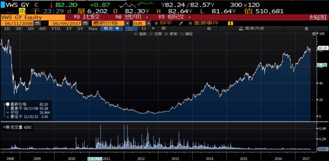 經(jīng)過5年的組件價格下跌,最終風電組件的價格穩(wěn)定在3.8元/W(這幾年都沒怎么大的波動)。而維斯塔斯由于隨后幾年不需要太多新的資本投入,技術進步帶來毛利率和凈利潤率的改善,使得VWS的roe不斷提高,從2009年的6.05%到2014年的20%,再到2016年的32%,其股價也接近創(chuàng)新高。
