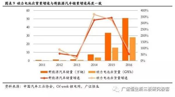 動力電池是指為新能源汽車、電動自行車等提供動力來源的電池,目前幾乎全部采用技術(shù)相對成熟的鋰電池。在國家能源戰(zhàn)略的指導(dǎo)規(guī)劃下,2014年以來新能源汽車相關(guān)政策集中出臺,加之國內(nèi)動力鋰電池技術(shù)不斷進(jìn)步,整個產(chǎn)業(yè)鏈進(jìn)入高速發(fā)展期。受到新能源汽車需求爆發(fā)的直接拉動,2014年以來動力電池出貨量也呈現(xiàn)同步高速增長態(tài)勢。