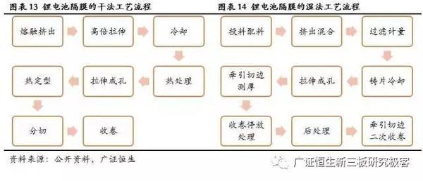 鋰電池隔膜的生產(chǎn)技術(shù)主要分為干法和濕法兩大工藝。干法工藝是將原料(PE或PP)進(jìn)行高溫成膜后退火處理,進(jìn)一步拉伸形成微孔膜;可細(xì)分為單向拉伸和雙向拉伸,其中干法雙拉工藝是中國科學(xué)院在20世紀(jì)90年代初開發(fā)出的具有自主知識產(chǎn)權(quán)的工藝。濕法工藝?yán)孟喾蛛x的原理,將小分子物質(zhì)與PE混合,加熱熔融后降溫進(jìn)行相分離,得到微孔膜。