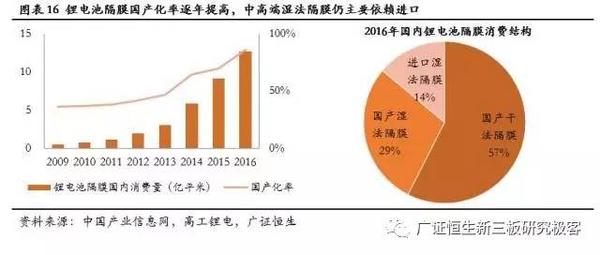 2016年隔膜國內(nèi)消費量數(shù)據(jù)顯示,隔膜的整體國產(chǎn)化率已經(jīng)達(dá)到86%;其中干法隔膜早已完全實現(xiàn)了國產(chǎn)化;而國內(nèi)濕法隔膜的出貨量也達(dá)到3億平米以上;但中高端濕法隔膜大多仍然依賴進(jìn)口,60%以上中高端市場被日本、韓國、美國等國外隔膜廠商所占有。