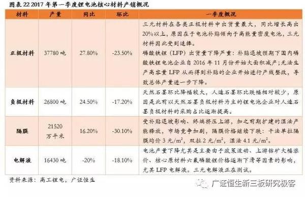 進(jìn)入2017年以來,受到新能源汽車行業(yè)的補(bǔ)貼退坡、推薦目錄“重做”的影響,新能源車企的訂單派發(fā)都比較謹(jǐn)慎,因此整個鋰電池產(chǎn)業(yè)鏈的行業(yè)風(fēng)向、出貨量和盈利水平都受到了一定程度的影響,特別在鋰電池四大核心材料:正極、負(fù)極、隔膜和電解液等細(xì)分領(lǐng)域反映得十分顯著。2017年第一季度產(chǎn)銷情況相比2016年第四季度整體呈下滑態(tài)勢,但更加符合高能量密度動力電池要求的三元正極材料、人造石墨和中高端濕法隔膜表現(xiàn)更優(yōu)。