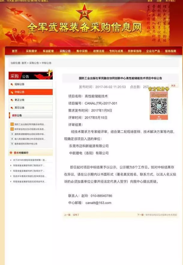 中國(guó)儲(chǔ)能網(wǎng)訊:全軍武器裝備采購(gòu)信息網(wǎng)于2017年6月初發(fā)布公告,國(guó)防工業(yè)出版社軍民融合協(xié)同創(chuàng)新中心高性能儲(chǔ)能技術(shù)項(xiàng)目評(píng)審工作圓滿完成,東莞市邁科新能源有限公司成為本次首家中標(biāo)該高性能儲(chǔ)能技術(shù)項(xiàng)目的企業(yè)。參與本次投標(biāo)的企業(yè)共22家,現(xiàn)場(chǎng)答辯入圍6家,中標(biāo)2家。