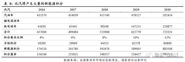 表中2016年數(shù)據(jù)來自乘聯(lián)會,汽油車按5%增速,新能源車按50%增速預(yù)測。觀察到的結(jié)果與比亞迪類似,因為有強(qiáng)大的新能源汽車產(chǎn)量,北汽也能產(chǎn)生相當(dāng)數(shù)額的新能源正積分。