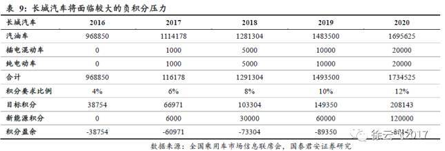 按汽油車15%的增速預(yù)測。由于長城汽車沒有新能源汽車產(chǎn)量作為支撐,所以逐漸產(chǎn)生新能源負(fù)積分。另外,因為長城汽車主打高油耗的SUV,2016年就以27萬的油耗負(fù)積分成為最大負(fù)積分車企。未來隨著新能源車的倍數(shù)放大效應(yīng)遞減,油耗負(fù)積分的壓力也將持續(xù)加大。目前看來,長城汽車將遭受雙積分政策嚴(yán)重的負(fù)面影響。不出意料,長城汽車將成為新能源積分交易市場的“大買家”。
