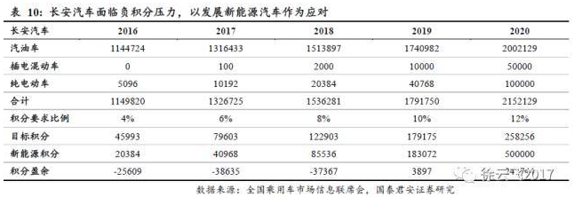 表中汽油車按照15%的增速進(jìn)行預(yù)測。自主品牌領(lǐng)頭羊長安汽車在油耗方面面臨巨大壓力。由于新能源車剛剛起步,規(guī)模尚小,傳統(tǒng)燃料汽車規(guī)模巨大,所以油耗積分和新能源積分都為負(fù)數(shù)。雖然2016年憑借第三階段油耗積分的結(jié)轉(zhuǎn)勉強(qiáng)維持小幅的積分赤字,但是雙積分政策的影響將是持續(xù)的。長安汽車認(rèn)識到問題并積極應(yīng)對,規(guī)劃在2020年實現(xiàn)15萬輛新能源車。同時進(jìn)軍油電混動汽車市場,將通過與科力遠(yuǎn)合作推出深混車型、自行研究48V微混技術(shù)等方式降低平均油耗。相比長城,長安的應(yīng)對更具有前瞻性。