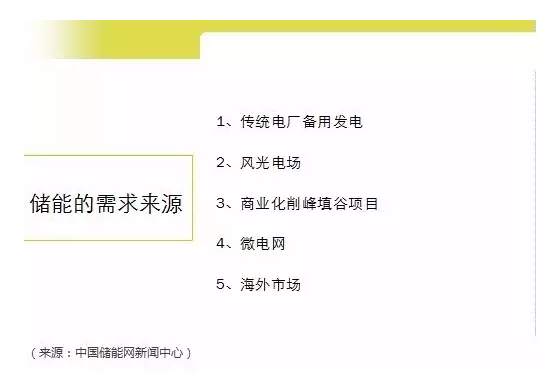 儲(chǔ)能聯(lián)盟發(fā)布了《儲(chǔ)能產(chǎn)業(yè)研究白皮書2017》,提到到 2020 年底,預(yù)計(jì)中國儲(chǔ)能技術(shù)總裝機(jī)規(guī)模將達(dá)到44GW。儲(chǔ)能的需求來源主要包括傳統(tǒng)電廠備用發(fā)電、風(fēng)光電場、商業(yè)化削峰填谷項(xiàng)目、微電網(wǎng)和海外市場等。