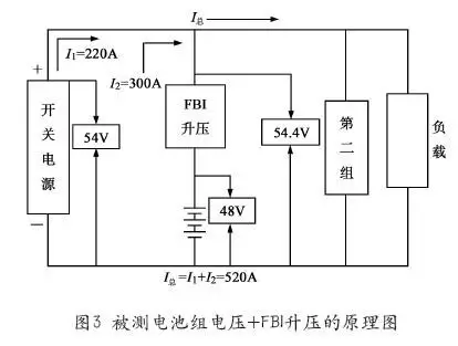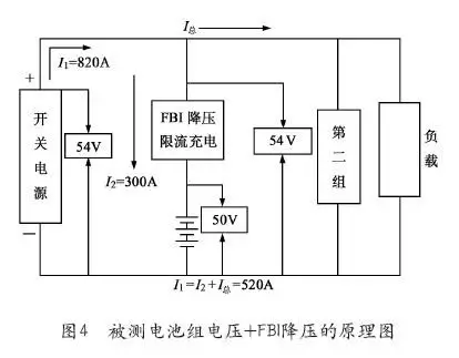 所謂“蓄電池組全在線容量試驗(yàn)”,是指在被測電池組和通信設(shè)備工作電源之間串聯(lián)一套“電池組全在線放電安全節(jié)能維護(hù)系統(tǒng)FBI”,讓被測電池組相對另一組處于浮充狀態(tài)的電池組具有略高電位的趨勢,并通過FBI系統(tǒng)的控制以使被測電池組能夠以恒定電流或恒定功率對在線負(fù)載設(shè)備進(jìn)行供電,隨著被測電池組電壓的下降,FBI系統(tǒng)自動實(shí)時(shí)升壓補(bǔ)償,以保持被測電池組所在支路電壓(被測電池組電壓+FBI升壓)始終保持與另一組電池等電位,但始終具有略高電位的趨勢,以使被測電池組能夠持續(xù)在線供電,當(dāng)被測電池組以恒定電流或恒定功率在線放電到預(yù)先設(shè)定的截止電壓后,FBI系統(tǒng)自動引導(dǎo)整流器在線對被測電池組充電恢復(fù),隨著被測電池組電壓的上升,FBI系統(tǒng)自動隨時(shí)降壓補(bǔ)償,以保持被測電池組所在支路電壓(被測電池組電壓+FBI升壓)始終保持與另一組電池等電位,直至被測電池組充電恢復(fù)完成。在此被測電池組全在線放電和充電過程中,另一組電池始終保持浮充狀態(tài)。采用FBI,徹底改變了以往蓄電池放電容量測試模式,解決了離線式測量法和在線式測量法的種種弊端。被測電池組電壓+FBI升壓的原理圖如圖3所示。當(dāng)然也可以采用被測電池組電壓+FBI降壓的模式。被測電池組電壓+FBI降壓的原理圖如圖4所示。