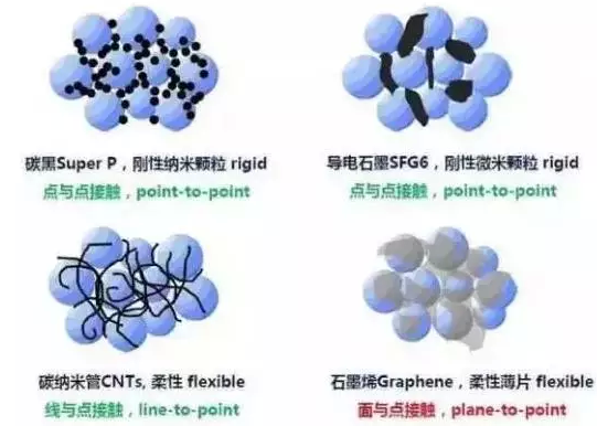 作為鋰離子電池導(dǎo)電劑材料使用的主要有常規(guī)導(dǎo)電劑SUPER-P、KS-6、導(dǎo)電石墨、碳納米管、石墨烯、碳纖維VGCF等,這些導(dǎo)電劑擁有各自的優(yōu)劣勢(shì)。具體來看: