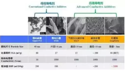 目前國(guó)內(nèi)鋰離子電池導(dǎo)電劑還是以常規(guī)導(dǎo)電劑SP為主。炭黑具有更好的離子和電子導(dǎo)電能力,因?yàn)樘亢诰哂懈蟮谋缺砻娣e,所以有利于電解質(zhì)的吸附而提高離子電導(dǎo)率。另外,炭一次顆粒團(tuán)聚形成支鏈結(jié)構(gòu),能夠與活性材料形成鏈?zhǔn)綄?dǎo)電結(jié)構(gòu),有助于提高材料的電子導(dǎo)電率。