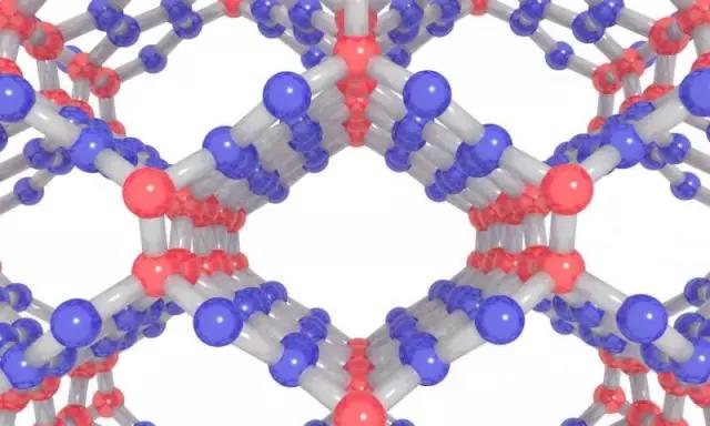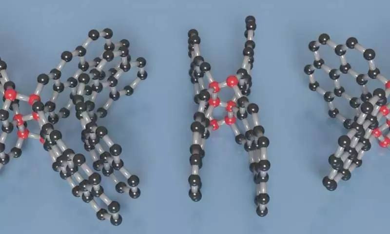 通過混合sp2 / sp3的通道觀察壓縮玻璃碳中的互穿石墨烯網(wǎng)絡(luò)。 石墨烯片(藍(lán)色球體)在菱形節(jié)點(紅色球體)處交聯(lián)。