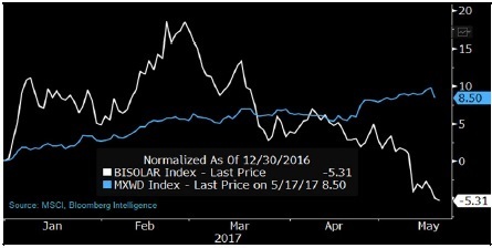 繼2016年大跌52%之后,2017年年初以來,BI 旗下行業(yè)研究的太陽能標(biāo)桿企業(yè)相關(guān)股指下跌5%。市場情緒可能已經(jīng)因為中美兩國貿(mào)易關(guān)系緊張(歐盟將對中國制造太陽能電池板的反傾銷關(guān)稅延長了18個月)、國際油價下跌、SolarWorld申請破產(chǎn)(2017年年內(nèi)股價重挫49%)而進(jìn)一步惡化。First Solar和SunPower(2017年股價分別漲9%和7%)這類美國太陽能企業(yè)削減成本的努力可能緩和市場對降價壓力和行業(yè)產(chǎn)能過剩的擔(dān)憂。