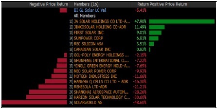 2017年,Bloomberg Intelligence 旗下研究的全球大型太陽能標(biāo)桿企業(yè)指數(shù)下挫5.3%,遜于同期上漲8.5%的MSCI 全球市場指數(shù)(MSCI ACWI Index)。德國太陽能制造商 SolarWorld 在 2017 年 5 月申請了破產(chǎn)、太陽能電池板價格下跌,同時美國住宅用太陽能增長緩慢、管線項目減少,這些因素都可能打擊業(yè)內(nèi)情緒。此外一些影響可能持續(xù)2017年全年:中美貿(mào)易關(guān)系一直緊張;中國十三五規(guī)劃的增長目標(biāo)也出現(xiàn)走低趨勢;內(nèi)需增長放緩對中國設(shè)備生產(chǎn)商構(gòu)成壓力。