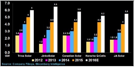 太陽能組件生產(chǎn)商在繼續(xù)增加產(chǎn)能,2015年出貨量排名前五的全球五大太陽能組件供應(yīng)商今年合計新增供應(yīng)電量有望達(dá)到7100兆瓦。這新一輪增長高潮的推手是今年上半年中國國內(nèi)強(qiáng)勁的太陽能需求,以及在中國以外地區(qū)供應(yīng)產(chǎn)品以獲得出口美國免稅的需求。晶科能源的目標(biāo)是挑戰(zhàn)天合光能,奪走后者以額定產(chǎn)能計最大生產(chǎn)商的地位。天合光能2016年額定產(chǎn)能高達(dá)6500兆瓦。
