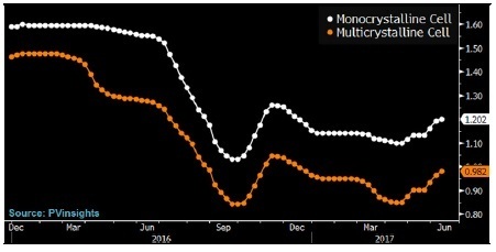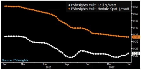 繼2016年下跌35%之后,太陽能電池板今年以來價格又跌去8%,在供應(yīng)過剩形勢惡化的影響下,下半年價格還會加速下跌。造成全球產(chǎn)能進(jìn)一步過剩的部分原因是美國和歐盟的貿(mào)易保護(hù)立場。太陽能報價機(jī)構(gòu)PVinsights稱,今年多晶硅太陽能電池板平均市場價格為每瓦0.35美元。降價趨勢迫使設(shè)備供應(yīng)商為保住利潤而大力削減成本。由此可以預(yù)料,今年下半年競爭將更為激烈。