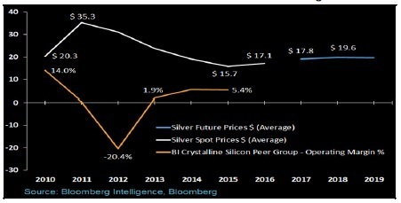 2016年現(xiàn)貨銀價均價為每盎司17.13美元,較2015年均價上漲9%,因此太陽能電池制造商2016年的盈利可能縮水。共識預(yù)期顯示,到2018年,銀價可能再攀升16%。這可能導(dǎo)致太陽能電池制造商的投入成本增加,但到2018年現(xiàn)貨銀價料將始終低于2012年到2014年的平均水平:每盎司24.90美元。太陽能制造商的盈利已經(jīng)與銀價呈現(xiàn)負(fù)相關(guān)。太陽能組件價格和多晶硅成本對制造商盈利也很重要。