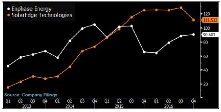 2017年1季度,太陽能逆變器供應(yīng)商Enphase推出最新款微型太陽能逆變器,集太陽能發(fā)電、儲能和家用能源管理系統(tǒng)于一身。其競爭對手SolarEdge正在向歐洲市場推廣類似產(chǎn)品。家用能源管理系統(tǒng)給逆變器供應(yīng)商帶來了售后服務(wù)的商機(jī),比如提高能源效率的服務(wù)、監(jiān)控以及保養(yǎng)設(shè)備。逆變器供應(yīng)商還可能開發(fā)新的銷售商機(jī),以滿足市場需求和電網(wǎng)的服務(wù),比如儲能集群產(chǎn)品。