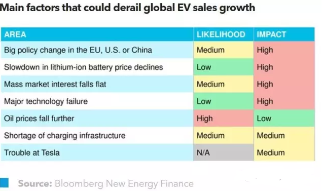 歐盟、美國、中國的主要政策變化是全球電動汽車行業(yè)面臨的最大威脅。目前,全球電動汽車市場仍嚴重依賴政策支持。在此背景下,只要全球超過2個主要市場的政策環(huán)境同時發(fā)生改變,電動汽車的銷售增長可能會受到嚴重影響。