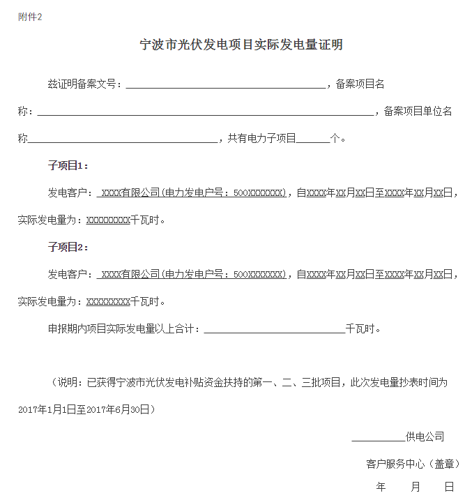 (三)已獲得寧波市光伏發(fā)電補貼資金扶持的項目(第一、二、三批)只需提交《寧波市光伏發(fā)電補貼資金申請表》和電網(wǎng)企業(yè)出具的項目實際發(fā)電量證明(2017年1月1日至2017年6月30日的新增發(fā)電量),申報材料要求同上。