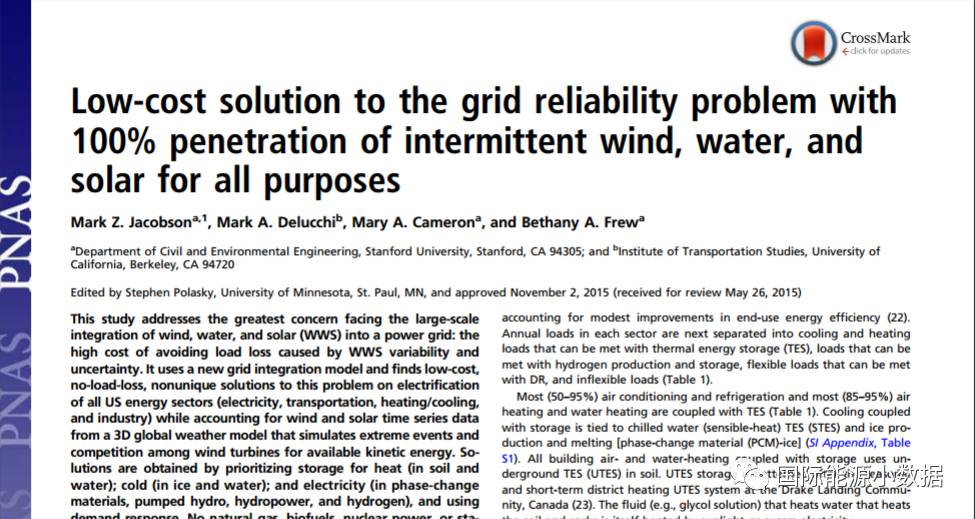 中國(guó)儲(chǔ)能網(wǎng)訊:2015年11月美國(guó)斯坦福大學(xué)Mark Z Jacobson教授等4位學(xué)者在《美國(guó)國(guó)家科學(xué)院院刊》(英語(yǔ):Proceedings of the National Academy of Sciences of the United States of America,通常簡(jiǎn)稱為PNAS)發(fā)表題為L(zhǎng)ow-cost solution to the grid reliability problem with 100% penetration