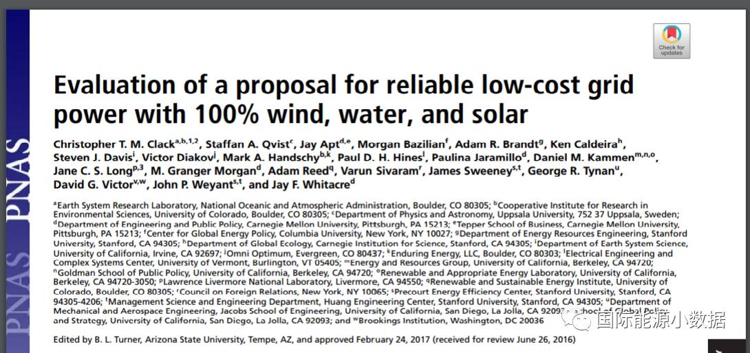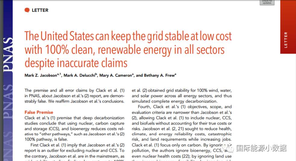 針對(duì)Mark Z Jacobson教授等學(xué)者的觀點(diǎn),在最近一期的PNAS雜志上發(fā)表了美國(guó)國(guó)家海洋和大氣管理局地球系統(tǒng)研究實(shí)驗(yàn)室的學(xué)者Christopher T. M. Clack等21位美國(guó)研究人員(包括物理學(xué)家、工程師、氣候?qū)<遥┑奈恼?,題目是Evaluation of a proposal for reliable low-cost grid power with 100% wind, water, and solar,認(rèn)為Mark Z Jacobson教授的研究使用了無(wú)效的模型工具和錯(cuò)誤模型,包括不可能和不適當(dāng)?shù)臄?shù)據(jù)和假設(shè)(比如大大高估了水電和氫能的潛力)。因此,Mark Z Jacobson教授關(guān)于2050-2055年實(shí)現(xiàn)100%可再生能源的結(jié)論不能成立,文章提醒政策制定者對(duì)待能源低碳轉(zhuǎn)型不能急于求成。
