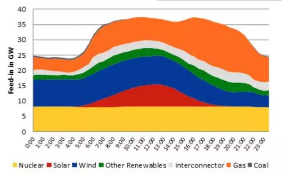 圖一:2017年6月7日英國(guó)各發(fā)電來(lái)源上網(wǎng)發(fā)電功率