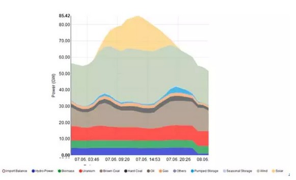 人們知道,就在2017年6月初,英國(guó)和德國(guó)的新能源發(fā)展先后到達(dá)了一個(gè)舉世矚目的重要節(jié)點(diǎn):就在6月7日這一天,英國(guó)超過(guò)50%的用電量是靠零排放的可再生能源來(lái)滿足的,而在德國(guó),這一比例已經(jīng)達(dá)到75%左右,中午13點(diǎn)30分,德國(guó)可再生能源發(fā)電功率達(dá)到了63GW的新高,其中光伏發(fā)電20GW,陸上風(fēng)力發(fā)電28GW,海上風(fēng)力發(fā)電4.5GW,水力發(fā)電4GW,生物質(zhì)發(fā)電5.5GW,其總比已經(jīng)接近75%這一很久以前人們認(rèn)定新能源所無(wú)法企及的高線。