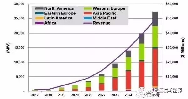 按地區(qū)分類的全球年度分布式、偏遠及離網(wǎng)太陽能光伏+儲能市場規(guī)模及供應(yīng)商營收,2017-2026年。圖片來源:Navigant市場調(diào)研公司