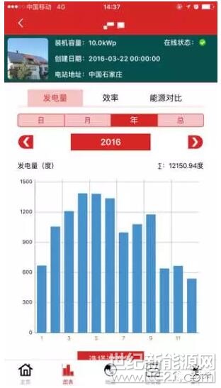 最近來自河北石家莊的居民給晶晶發(fā)來了一張光伏電站的監(jiān)控截圖,從這張截圖我們可知,該光伏電站一共10KW,2016年一共發(fā)電12150.94度,發(fā)電小時(shí)數(shù)為1215.09h,符合石家莊市的光照條件及發(fā)電預(yù)期。