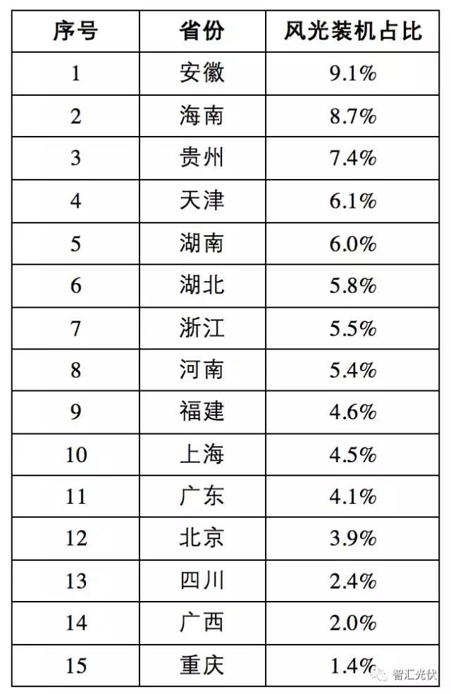 截至2016年底,全國各省風電、光伏累計裝機占比不足10%以上的省份如下表。