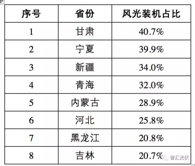 截至2016年底,全國各省風電、光伏累計裝機占比達到20%以上的省份如下表。