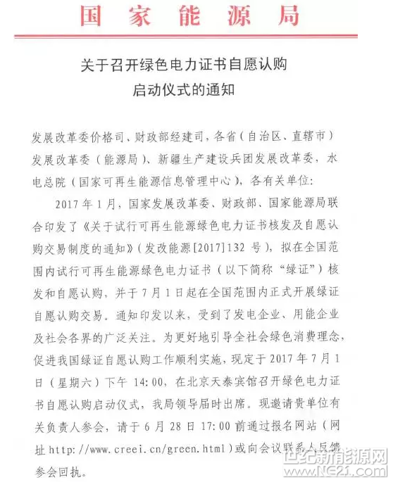 2017年7月1日,國家能源局即將召開綠色電力證書自愿認購啟動儀式: