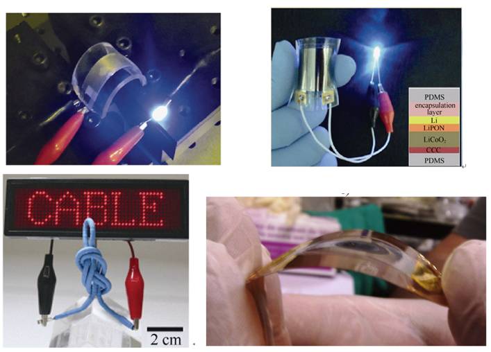 比如像以下幾幅圖中所示的可彎曲薄膜型電池,以及可打結(jié)電纜型電池。