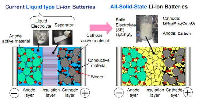 液態(tài)鋰離子電池(左),固態(tài)鋰離子電池(右)