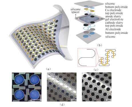 (4)可拉伸電池??衫炱骷强衫祜@示、可拉伸天線(xiàn)、人工肌肉及皮膚傳感器等新興領(lǐng)域的關(guān)鍵技術(shù)。此時(shí)要求電池能承受至少1%的應(yīng)變,不僅能彎曲,還要能拉伸、卷繞、壓縮等。為了滿(mǎn)足這些要求,可以通過(guò)優(yōu)化材料(織物、纖維、橡膠、彈性體等可拉伸物質(zhì)),以及結(jié)構(gòu)設(shè)計(jì)(通過(guò)為材料設(shè)計(jì)和使用一些可以抵抗拉伸的宏觀結(jié)構(gòu),如都通過(guò)預(yù)加應(yīng)力、應(yīng)變方法,使材料初始位于壓縮/褶皺/曲折狀態(tài))來(lái)制備可拉伸電池。代表性的工作是XU等制備的高拉伸比鋰離子電池,該電池使用了分段的布局及對(duì)稱(chēng)的可變形蛇紋彎曲狀的電學(xué)接觸結(jié)構(gòu),具有300%的拉伸變形度和200%的可逆變形度。