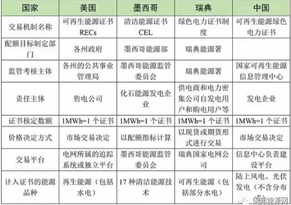 首先來看比較成功的美國,美國配額制履責主體(通常是售電公司)的責任核查、計量以可再生能源證書(Renewable Energy Certificates,RECs,以下簡稱證書)形式實現。美國的配額制規(guī)定每兆瓦時可再生能源電力的產生,即同時生成一個證書。證書與可再生能源電力捆綁,并在發(fā)電公司和售電公司之間交易??稍偕茉措娏Φ浇K端用戶即被消費掉,而證書則被留在了售電公司,用以被核查。滿足配額要求的多余證書可在售電企業(yè)之間通過電網進行交易??稍偕茉措娏途G色證書生產、交易、銷售的每一個環(huán)節(jié)均有電網間建立的“追蹤系統(tǒng)”負責計量和監(jiān)測。