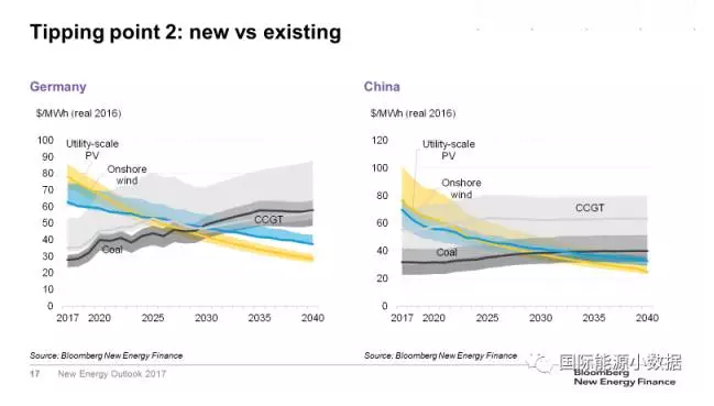第一個臨界點是:在沒有補貼的情況下,新建風電、光伏電站發(fā)電成本可與新建煤電、天然氣電站競爭。在目前的市場條件下,在很多國家已經(jīng)接近這一臨界點。在德國,新建陸上風電的發(fā)電成本已經(jīng)低于煤電、天然氣發(fā)電;在中國,目前煤電成本在各類電源中依然是最低的,但是預期2019年陸上風電成本將低于煤電、2021年光伏成本也將低于煤電;在美國,天然氣發(fā)電是各類電源中成本最低的,但預計2022-2023年風電、光伏成本均將低于天然氣發(fā)電;在印度,預計2020年起新建光伏將在全國范圍內(nèi)低于煤電。
