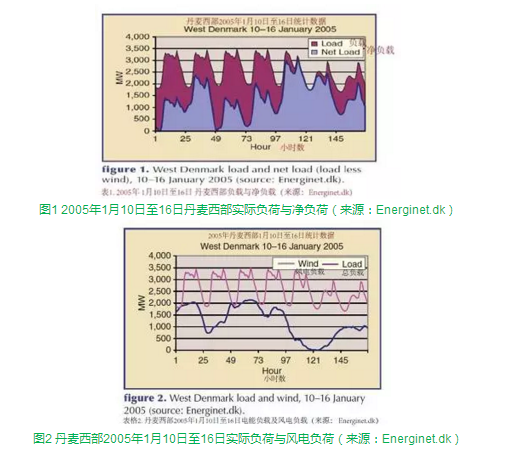 單個(gè)或多個(gè)風(fēng)電場(chǎng)的發(fā)電量是隨時(shí)間而變化的。風(fēng)電的變動(dòng)性加之電力系統(tǒng)原本就存在的變動(dòng)性,可能會(huì)增加變動(dòng)的復(fù)雜性,需要電網(wǎng)運(yùn)營商進(jìn)行管理和調(diào)控。風(fēng)能每發(fā)1度電,其他發(fā)電形式就可以少發(fā)1度電,所以其他的發(fā)電系統(tǒng)只需要滿足除風(fēng)電之外的負(fù)荷需求,這部分負(fù)荷經(jīng)常被稱作凈負(fù)荷(除風(fēng)電外負(fù)荷)。因此,整個(gè)電力系統(tǒng)的非風(fēng)力發(fā)電部分就要被調(diào)控至凈負(fù)荷,即整個(gè)電力系統(tǒng)負(fù)荷與風(fēng)電負(fù)荷之差。圖1顯示了丹麥西部地區(qū)一周內(nèi)的實(shí)際負(fù)荷與凈負(fù)荷,兩條曲線之間部分就是風(fēng)電部分。圖2更清晰地表示了實(shí)際負(fù)荷與風(fēng)電負(fù)荷之間的對(duì)比。