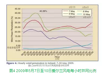 一些國家的電網(wǎng)運(yùn)營商在積累高比例風(fēng)電并網(wǎng)及其變化規(guī)律的運(yùn)營經(jīng)驗(yàn)。圖4顯示了從2009年5月7日至10日,愛爾蘭風(fēng)電的每小時(shí)接入比例,范圍從很小的比例到高達(dá)40%。同樣,圖1(如上所述)顯示了2005年1月丹麥的實(shí)際負(fù)荷與凈負(fù)荷(減去風(fēng)電后的負(fù)荷)。該圖顯示風(fēng)力發(fā)電量逐漸增加,而后由高風(fēng)速導(dǎo)致停機(jī)使發(fā)電量減少。更高的風(fēng)力發(fā)電量使得凈負(fù)荷在某些時(shí)段接近于零。正如本文后面討論的,電網(wǎng)運(yùn)營商通過使用現(xiàn)有的靈活發(fā)電資源、風(fēng)力預(yù)測(cè)以及時(shí)間調(diào)度等手段,來應(yīng)對(duì)風(fēng)力的變化。在以更接近于實(shí)時(shí)的情況下進(jìn)行評(píng)估時(shí),發(fā)電量更具可預(yù)測(cè)性,而小于小時(shí)單位的調(diào)度方案也使電網(wǎng)運(yùn)營方可以充分利用其他發(fā)電設(shè)備的靈活性。此外,更大范圍內(nèi)(或電網(wǎng)覆蓋區(qū)域)的電力平衡有助于解決風(fēng)電的變化,因?yàn)樵谳^大的地理區(qū)域內(nèi)風(fēng)電的波動(dòng)性會(huì)趨于平緩。