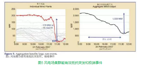 遇極端天氣情況,風(fēng)速增大,出于安全考慮,風(fēng)電機(jī)組需要停機(jī),這時(shí)候怎么辦呢?這樣的極端天氣并不常見,在一些地方并不是每年都會(huì)出現(xiàn),而有些地區(qū)一年中也只會(huì)出現(xiàn)一到兩次。大風(fēng)暴在4到6小時(shí)就可行進(jìn)幾百公里,所以,廣闊地理區(qū)域的風(fēng)電集群可以應(yīng)對(duì)這一挑戰(zhàn)。在這種情況下,單臺(tái)風(fēng)電機(jī)組可能從滿發(fā)突然降到零,而更大地理范圍內(nèi)的集群風(fēng)電機(jī)組就會(huì)把這樣的突然中斷轉(zhuǎn)化為數(shù)小時(shí)的逐漸下降過程。2007年2月美國德克薩斯州就發(fā)生了這樣的風(fēng)暴。圖5顯示了一個(gè)風(fēng)電場(chǎng)的出力在約15分鐘內(nèi)驟降17萬千瓦的過程。而對(duì)于所有風(fēng)電場(chǎng)來說,總出力雖然下降了150萬千瓦,但該過程持續(xù)了2個(gè)小時(shí)。在丹麥西部,最近一次風(fēng)暴(2005年1月)使200萬千瓦額定容量的風(fēng)電出力降低90%,用了6個(gè)小時(shí)。