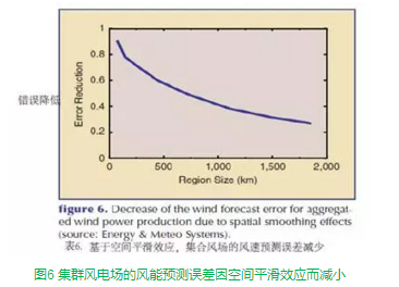 如圖所示,750公里以上范圍的風(fēng)電集群預(yù)測(cè)誤差降低了50%。圖中顯示了誤差率已經(jīng)降至區(qū)域預(yù)測(cè)和單一風(fēng)電場(chǎng)的標(biāo)準(zhǔn)誤差(RMSE)之間,以上數(shù)據(jù)是基于對(duì)德國40個(gè)風(fēng)電場(chǎng)所發(fā)電量的測(cè)量結(jié)果得到的。德國的一些其他研究顯示,對(duì)于一個(gè)獨(dú)立風(fēng)電場(chǎng)的典型風(fēng)能預(yù)測(cè)誤差約為該風(fēng)電場(chǎng)裝機(jī)容量的10%~15%標(biāo)準(zhǔn)誤差(RMSE),而對(duì)未來一天某一區(qū)域的誤差率降至6%~8%,對(duì)于整個(gè)德國的風(fēng)能預(yù)測(cè)誤差降至5%~7%。如標(biāo)準(zhǔn)誤差(RMSE)法所測(cè)算的那樣,綜合應(yīng)用不同的風(fēng)能預(yù)測(cè)模型,也能提高最多20%的風(fēng)能預(yù)測(cè)精度。