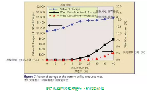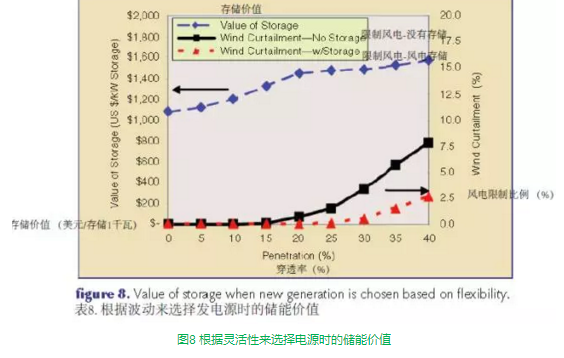 圖7是近似于美國西部電網(wǎng)調(diào)度的一個(gè)簡單例子,圖中所有數(shù)值僅供參考,假定一個(gè)為高峰負(fù)荷的10%、具有168小時(shí)的儲(chǔ)能能力的儲(chǔ)能設(shè)備,然后進(jìn)行儲(chǔ)能分析。系統(tǒng)大量接納風(fēng)電的能力主要取決于其他多種電源的構(gòu)成情況。儲(chǔ)能是一種靈活的電源形式,即使系統(tǒng)中沒有風(fēng)電,儲(chǔ)能本身對(duì)電網(wǎng)系統(tǒng)來說也是具有經(jīng)濟(jì)價(jià)值的。隨著風(fēng)電并網(wǎng)量的增加,儲(chǔ)能系統(tǒng)的價(jià)值也相應(yīng)提升。沒有風(fēng)電的情況下,儲(chǔ)能的價(jià)值在每千瓦超過1000美元,可見,低成本的儲(chǔ)能設(shè)備為系統(tǒng)提供了可觀的經(jīng)濟(jì)價(jià)值。隨著風(fēng)電接入比例的提高,儲(chǔ)電系統(tǒng)的價(jià)值也會(huì)增加,最終能達(dá)到每千瓦1600美元左右。目前美國很多地區(qū)的電源結(jié)構(gòu)與這個(gè)例子中的情況很接近。在風(fēng)電占比很高的系統(tǒng)中,儲(chǔ)能具有更大價(jià)值,因?yàn)檎{(diào)度起來更經(jīng)濟(jì),從而使可變成本較低的發(fā)電機(jī)組(諸如火電和核電)的利潤空間受到壓縮(及產(chǎn)生市場(chǎng)出清價(jià)格)。更多的低電價(jià)時(shí)段拉大了價(jià)差,增加了套利的機(jī)會(huì),提升了儲(chǔ)能的價(jià)值。
