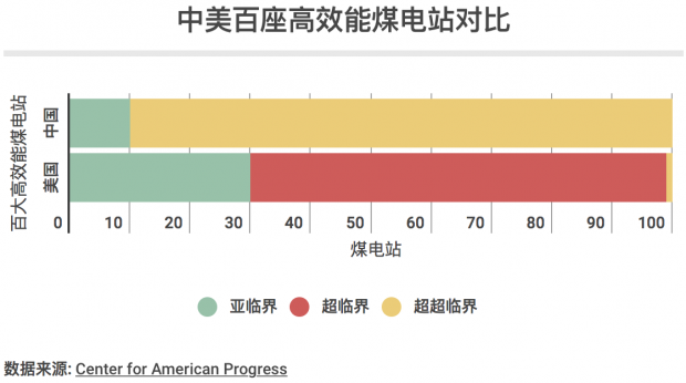 超超臨界燃煤發(fā)電技術(shù)也有望幫助相關(guān)電廠達(dá)到這個(gè)相對嚴(yán)格的環(huán)保要求。相比于亞臨界燃煤機(jī)組,超超臨界火力發(fā)電機(jī)組的燃煤溫度更高(約760攝氏度),內(nèi)部壓力也更大(超過3萬多千帕),因此發(fā)電效率也更高。美國進(jìn)步中心(Center for American Progress,后文簡稱CAP)最新發(fā)布的一份報(bào)告顯示,中國能效最高的100家燃煤電廠中超過90%配備了超超臨界技術(shù)設(shè)備,而美國的這一數(shù)字僅為0.76%。顯然,中國在這一方面步子邁得比美國更大。