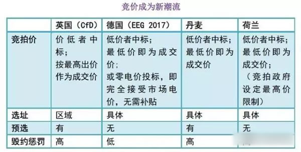競拍規(guī)則各國有所不同,歐洲各國均采取度電價(jià)格投標(biāo),以價(jià)低者中標(biāo),但最后出清價(jià)格各異,其中英國以競拍最高價(jià)出清,而大多數(shù)國家采用中標(biāo)價(jià)出清。而中國的特許經(jīng)營權(quán)綜合考量多方因素,價(jià)格只是其中一個(gè)要素。美國則采用商業(yè)租賃的形式,拍賣土地,價(jià)高者獲得。