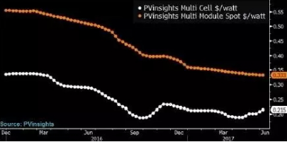 太陽(yáng)能電池板的價(jià)格目前就呈現(xiàn)下降趨勢(shì),繼2016年下跌35%之后,2017年又下跌8%,在供應(yīng)過(guò)剩形勢(shì)惡化的影響下,下半年價(jià)格還會(huì)加速下跌。太陽(yáng)能報(bào)價(jià)機(jī)構(gòu)PVinsights稱(chēng),今年多晶硅太陽(yáng)能電池板平均市場(chǎng)價(jià)格為每瓦0.35美元。降價(jià)趨勢(shì)迫使設(shè)備供應(yīng)商為保住利潤(rùn)而大力削減成本。由此可以預(yù)料,今年下半年競(jìng)爭(zhēng)將更為激烈。